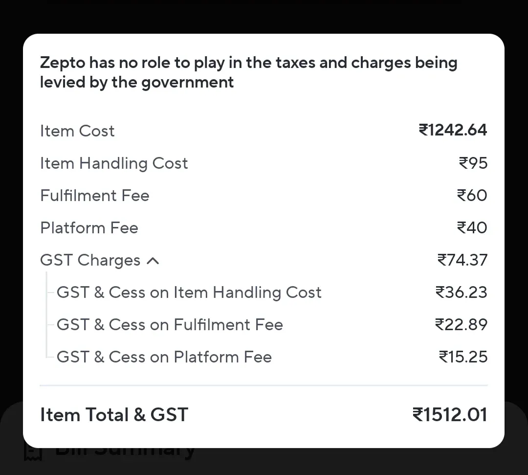 In a recent bill (see screenshot), a user was charged ₹1242.64 for items. Seems normal. But then: