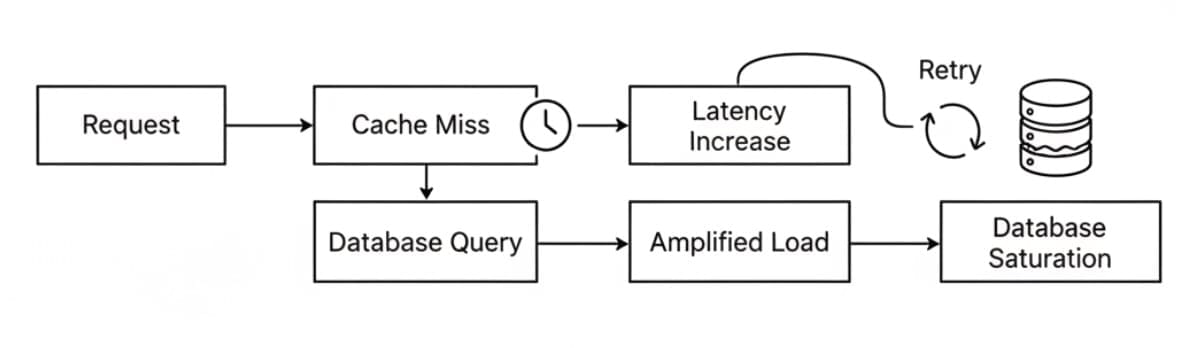 If those keys expire simultaneously, millions of requests instantly bypass cache protection and converge on backend databases. The database is not sized for total traffic. It is sized for cache misses. When misses spike beyond expected levels, collapse is immediate.