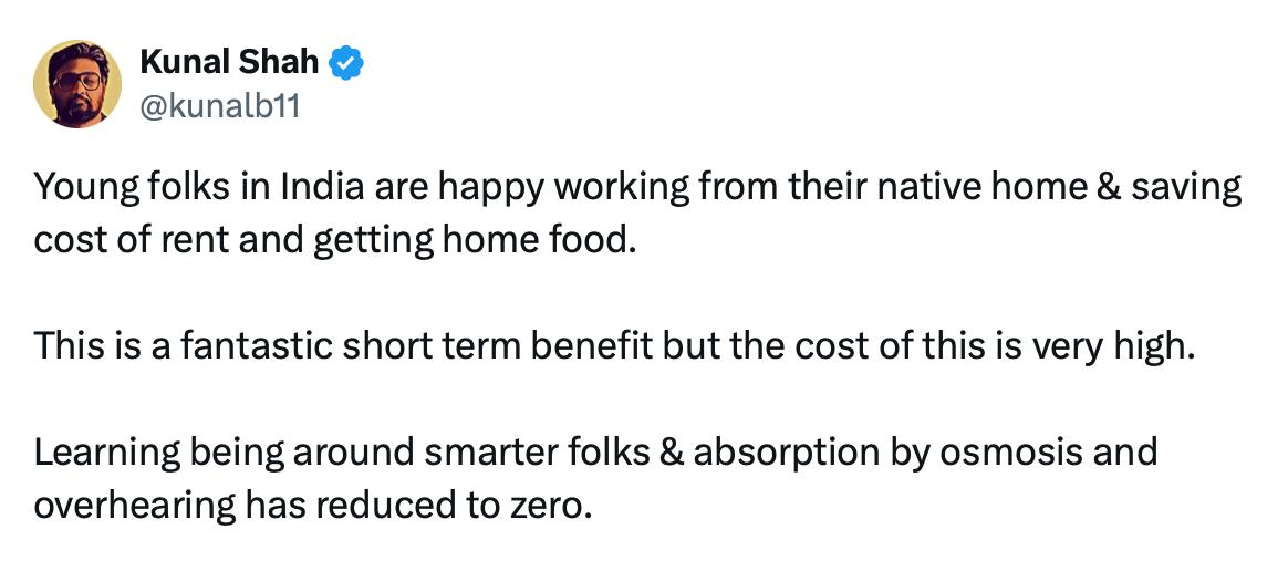 We already know the social side of this matters. That's why we send kids to schools and colleges, not just to read textbooks but to interact, to learn from peers, to form networks, to grow socially. Everyone accepts that as obvious. So why do we flip our stance once the same kids graduate and start jobs? Why do we suddenly act like learning and growth can happen in isolation?