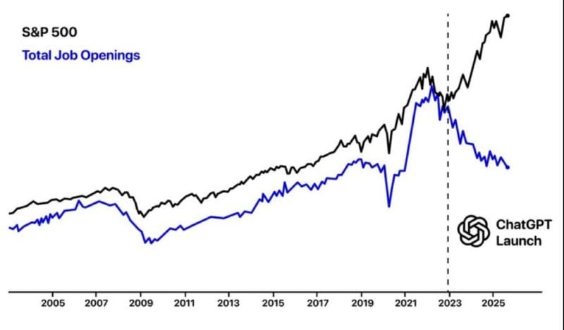 Look at what happened after ChatGPT launched. S&P 500 performance kept climbing, but total job openings started dipping hard. Markets were saying “work can be done faster,” while hiring slowed because companies suddenly had leverage. Productivity was going up without adding more people. That divergence isn’t an accident. It’s the first visible economic footprint of LLM‑driven efficiency. A preview of how industries adapt long before individuals accept the shift.